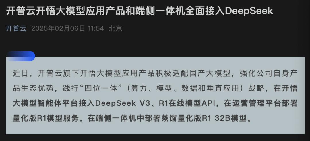 開普云則宣布在開悟大模型智能體平臺接入DeepSeek V3、R1在線模型API,在運營管理平臺部署量化版R1模型服務,在端側(cè)一體機中部署蒸餾量化版R1 32B模型。