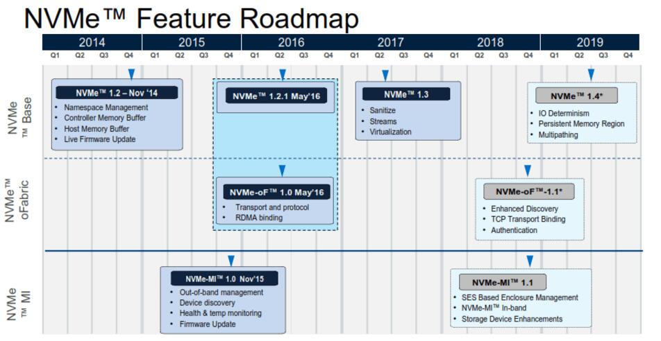 第一個NVMe規(guī)范逐漸增加了更新的功能——1.2版本中的實時固件更新和1.3版本中的清理功能已經在SCSI和SATA中很常見了。明年年中推出NVMe 1.4版本將增加IO Determinism功能,以確保跨網絡和存儲的緊密且一致的延遲。同時,新增的管理規(guī)范也提供了管理設備機箱的能力。